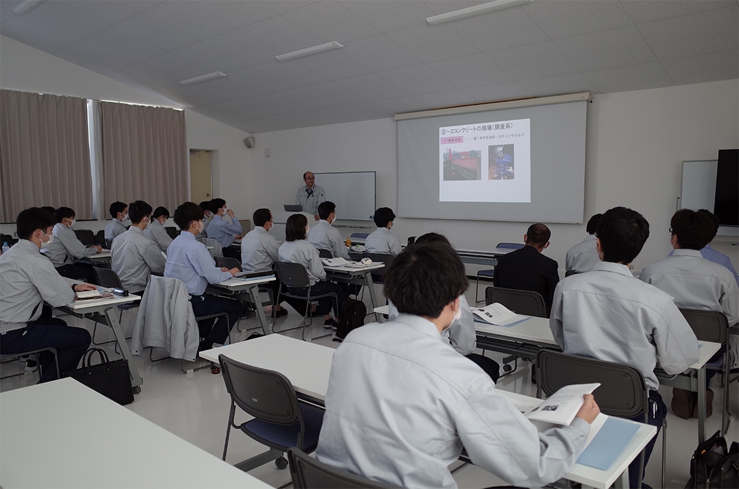 発表や調査・試験方法の講習を行います。この講習会により得意分野だけでなく、専門外の分野についても知識をつけることができ、オールマイティーな技術者を育成します。